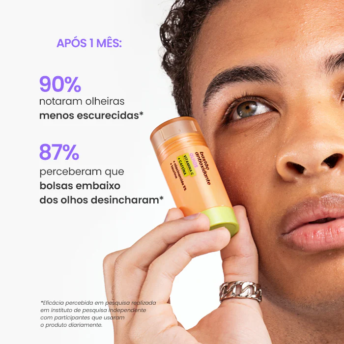 bastão para área dos olhos com vitamina C e cafeína, que desincha bolsas, suaviza olheiras de cansaço e proporciona efeito “geladinho”